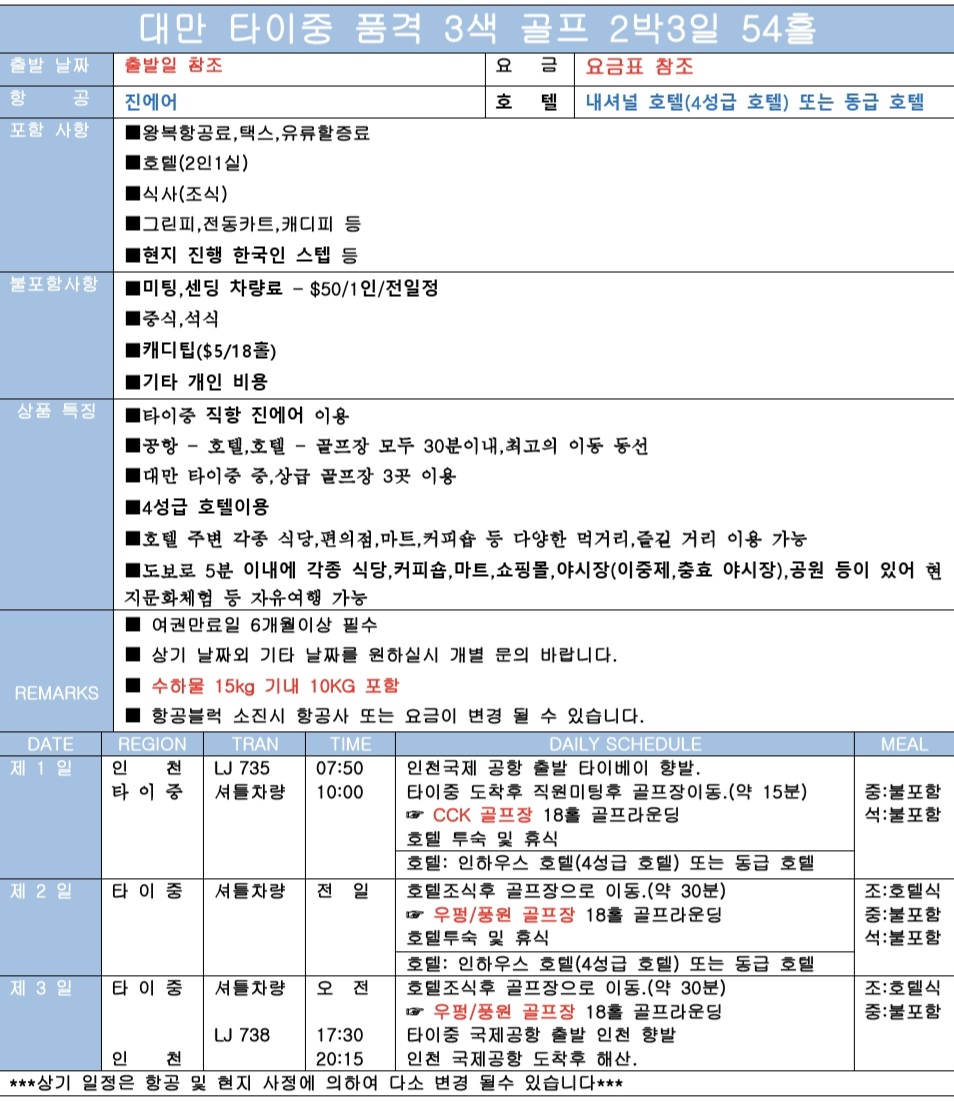 대만 타이중 품격 3색 골프+관광 2박3일BESTMDHOT